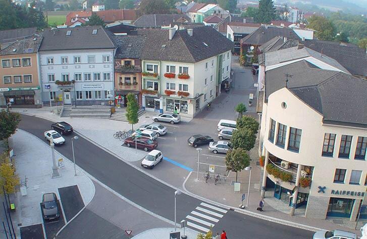 Das Gebäude der UNIQA Generalagentur Hauser und Partner aus der Vogelperspektive mit dem umliegenden Marktplatz.